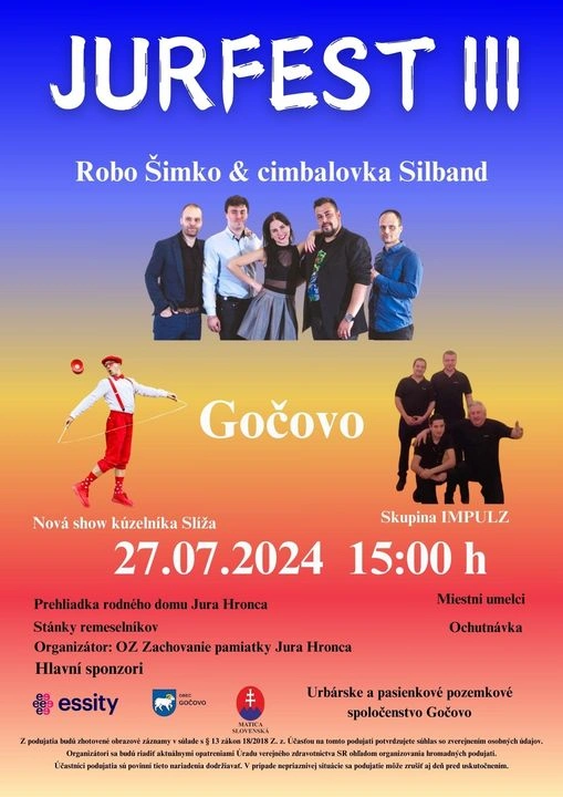 Príďte si užiť skvelý deň na JURFEST III, ktorý sa koná 27. júla 2024 o 15:00 v Gočove! Vystúpi Robo Šimko s cimbalovou Silband a skupina IMPULZ, a tešiť sa môžete aj na novú show kúzelníka Slíža. Súčasťou podujatia bude prehliadka rodného domu Jura Hronca, stánky remeselníkov, miestni umelci a ochutnávka miestnych špecialít. Vašou účasťou podporíte OZ Zachovanie pamiatky Jura Hronca a miestne urbárske a pasienkové spoločenstvo. Nezmeškajte túto skvelú príležitosť na zábavu a podporu dobrej veci!