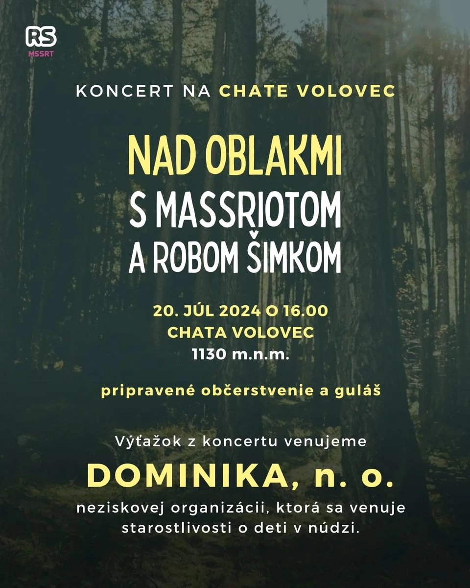 Už budúcu sobotu sa vidíme na nezabudnuteľnom koncerte Nad oblakmi s Robom Šimkom a skupinou Massriot na Chate Volovec! Príďte si užiť skvelú hudbu, chutný guláš a osviežujúce nápoje. Svojou účasťou podporíte neziskovú organizáciu DOMINIKA, ktorá pomáha deťom zo znevýhodneného prostredia. Príďte sa zabaviť, podporiť dobrú vec a užiť si krásny deň s úžasnou hudbou a skvelými ľuďmi. Vidíme sa na Chate Volovec!